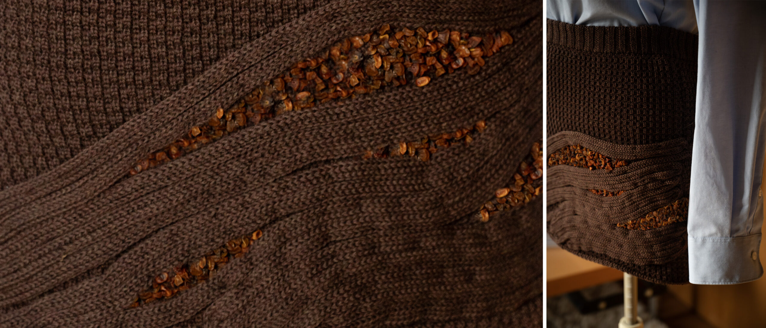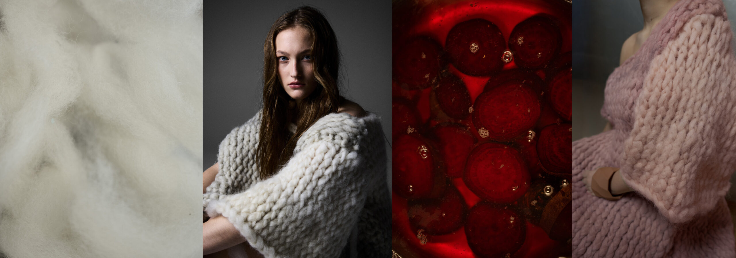 Only afterwards was it gently tinted with beetroot pigments, allowing colour to settle into the fibres without erasing their origin. The piece is 100% compostable and reflects on purity and process, on what it means to leave something intact while still transforming it. In its softness and slight resistance, the sweater carries the quiet presence of the animal, the field, and the hand that shaped it.