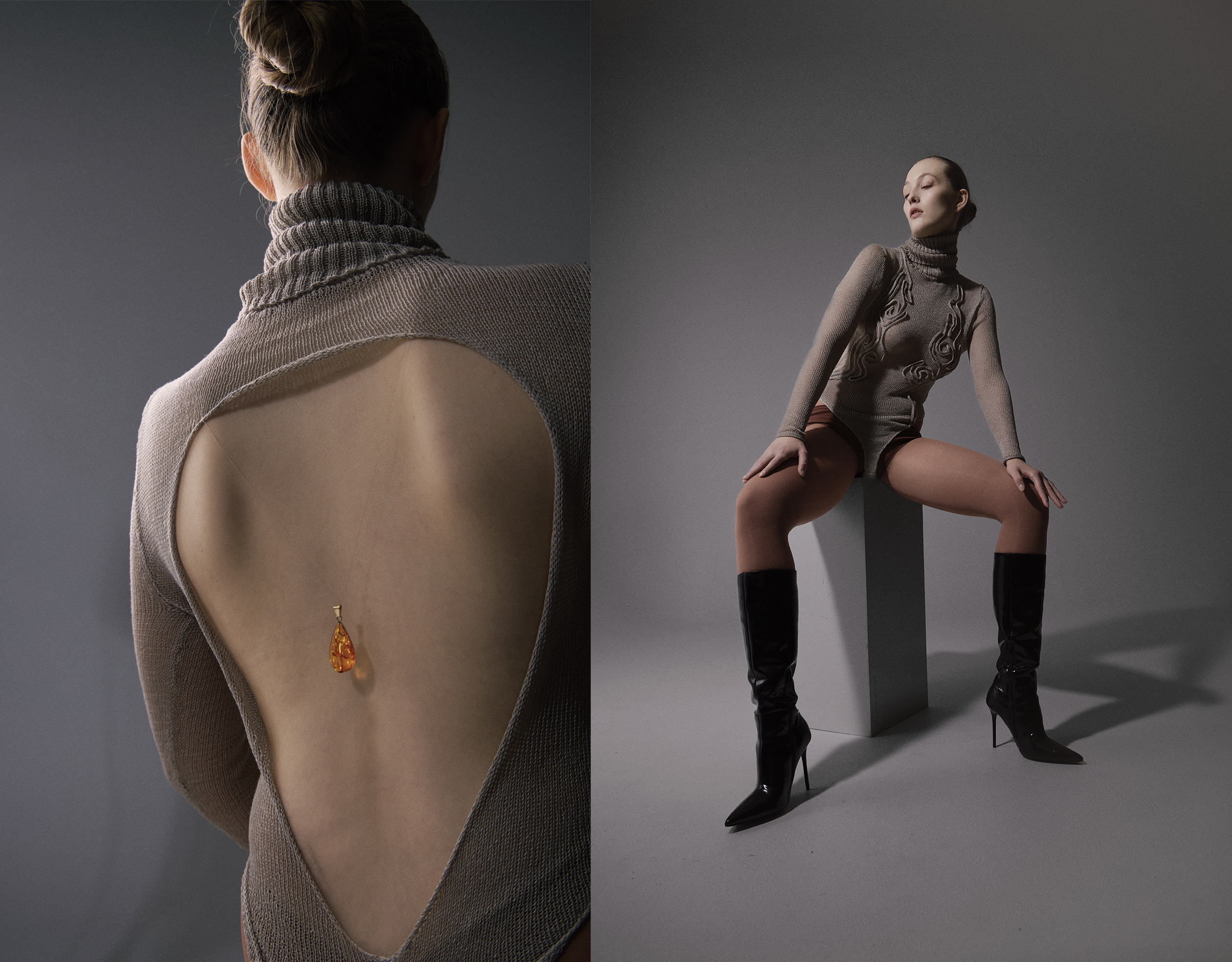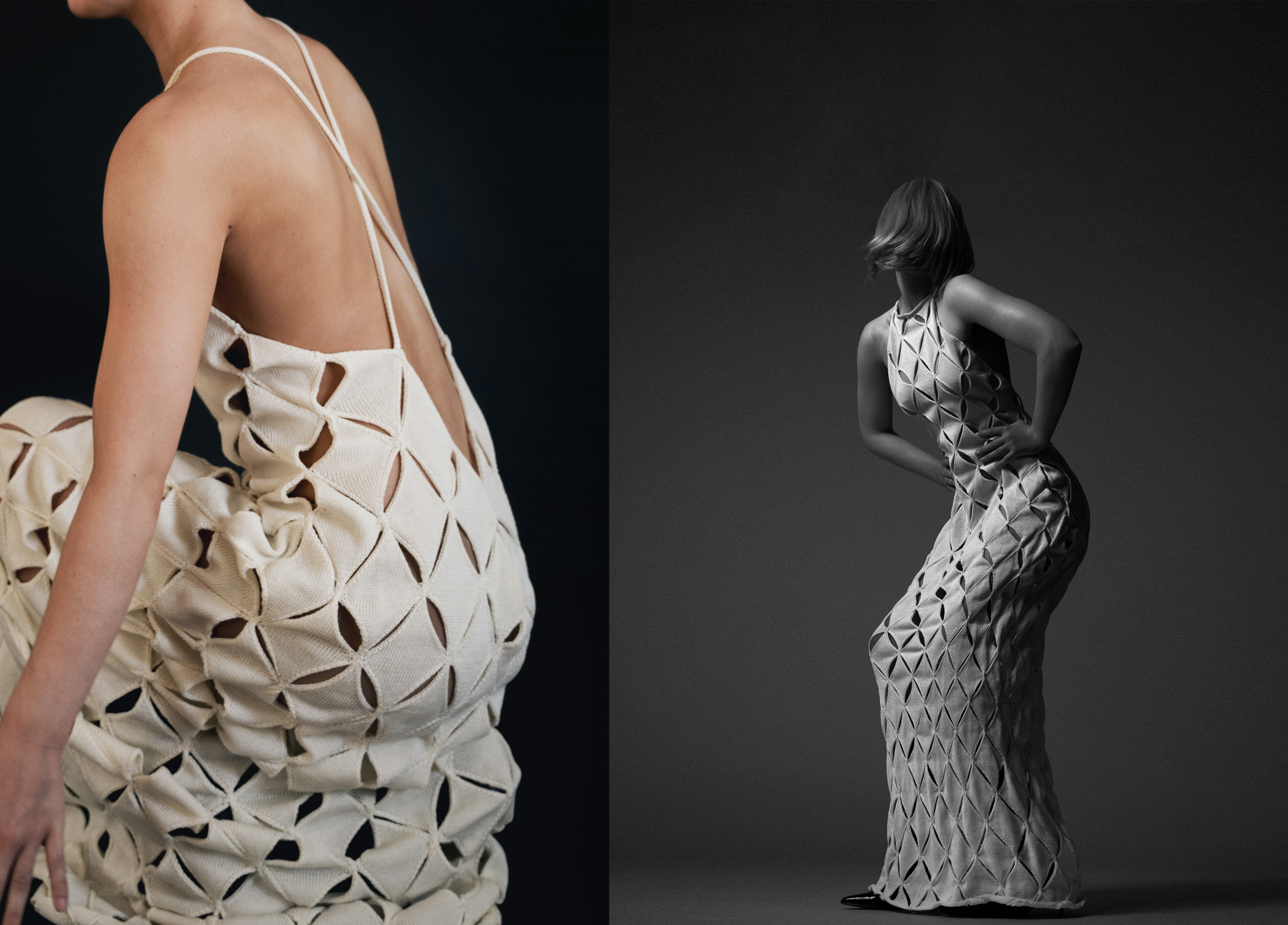 The Affinity dress is crafted partly on a Silver Reed knitting machine and partly by hand, using soft cotton yarn. It explores the interplay between technique and material, highlighting the way individual threads converge to form a greater whole. The piece reflects the idea that everything is connected, each element dependent on the other, and invites the wearer to consider their place within this shared network of relationships. In its texture, structure, and form, the dress becomes a meditation on connection, continuity, and the subtle power of interdependence.