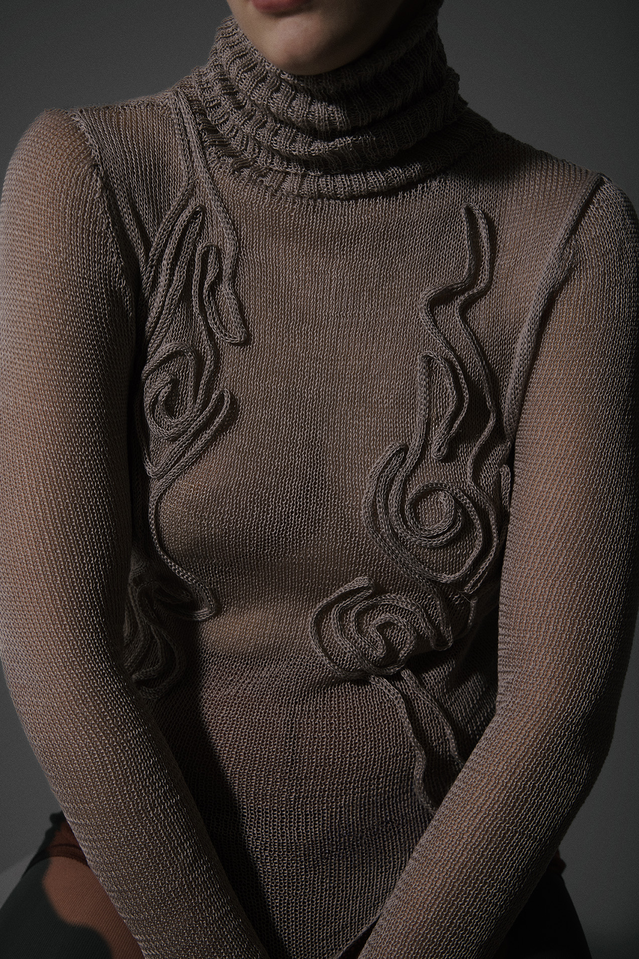 In its form, the garment becomes a meditation on relationships — how lives, ideas, and forces may split apart yet remain in dialogue, drawn back together by invisible currents. Every stitch traces connection and divergence, a tangible reflection of continuity and flow, making the piece not only a garment but a narrative of interdependence.