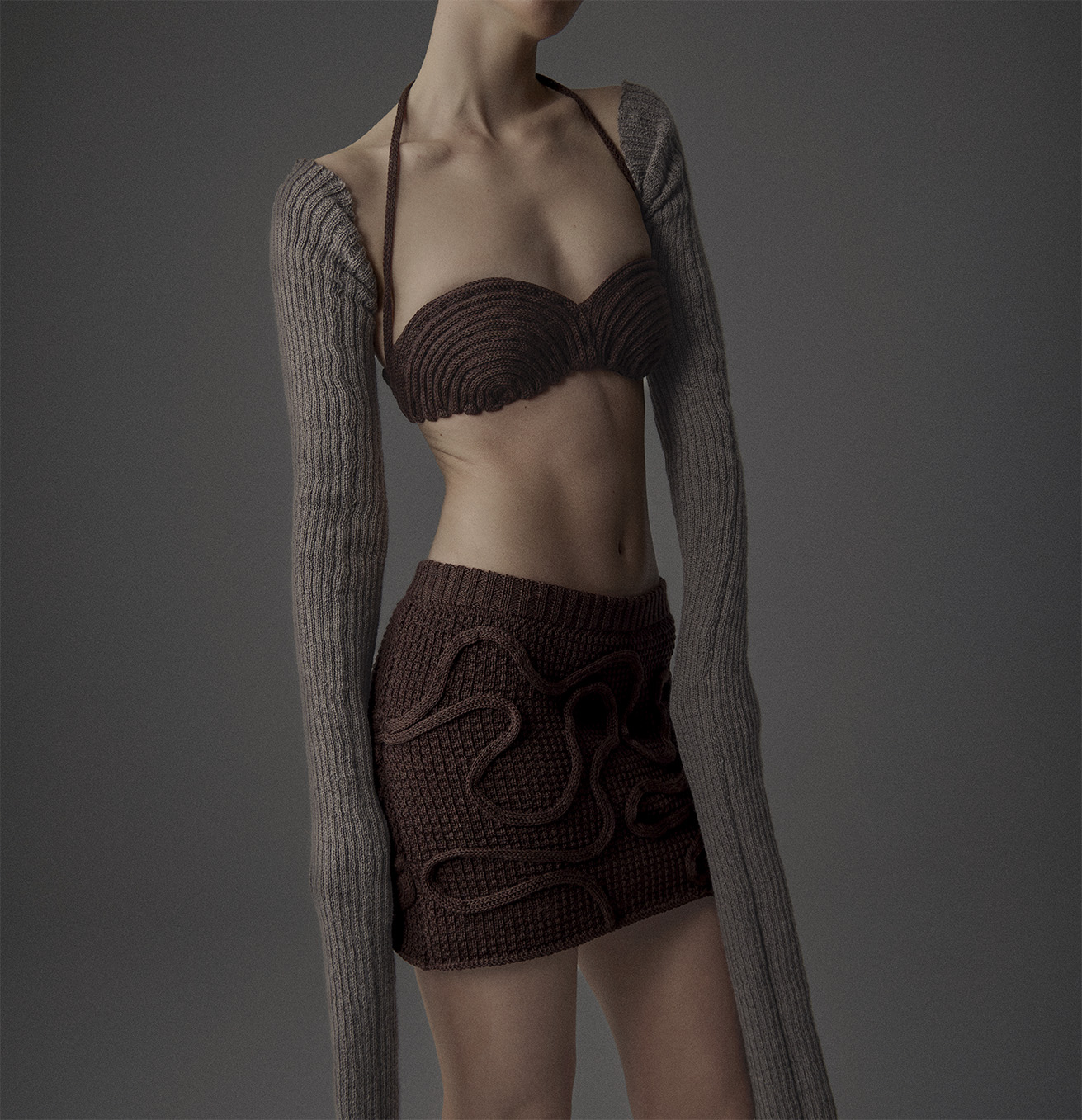 Growth is a fully compostable wool ensemble — skirt, bralette, and arm warmers — designed to honour the potential inherent in natural materials. Its sinuous patterns suggest the movement of life beneath the surface, showing how fibres, once returned to the soil, nurture new life and continue the cycle of creation.